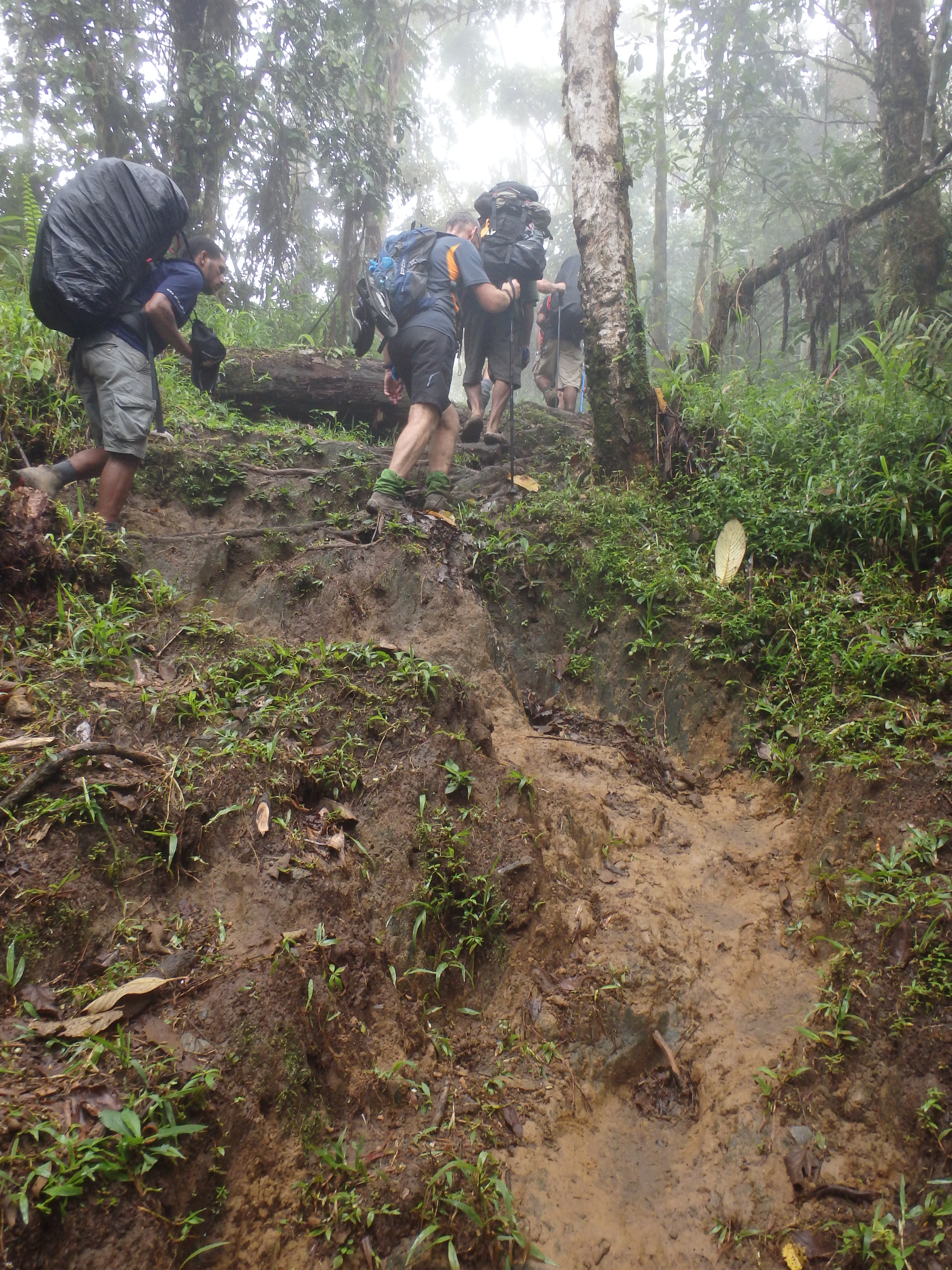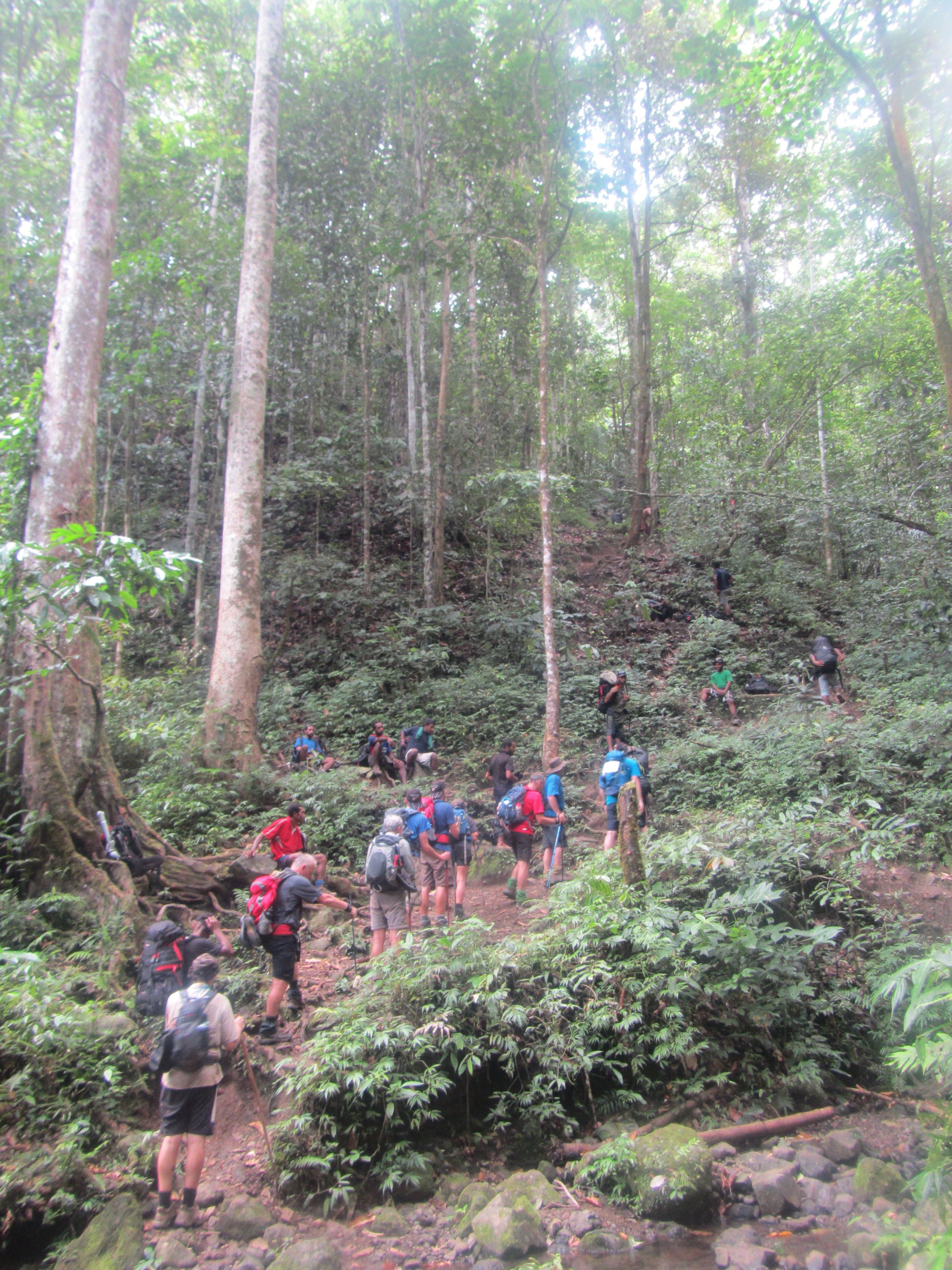 We set off after breakfast and begin the descent down the mountain and reach another creek crossing where we need to use our waterproof shoes again, so out come the pink crocs! Little did we know that we would be walking through about 8 or 9 crossings of the same river wearing these shoes. This went on for about an hour or so but I was pretty happy ambling along through the cool water as I knew after we had made it though this section we were about to walk up one of the toughest mountains of all time…. the Imita Ridge. Yeah it even sounded scary. Just under a kilometre of straight up.