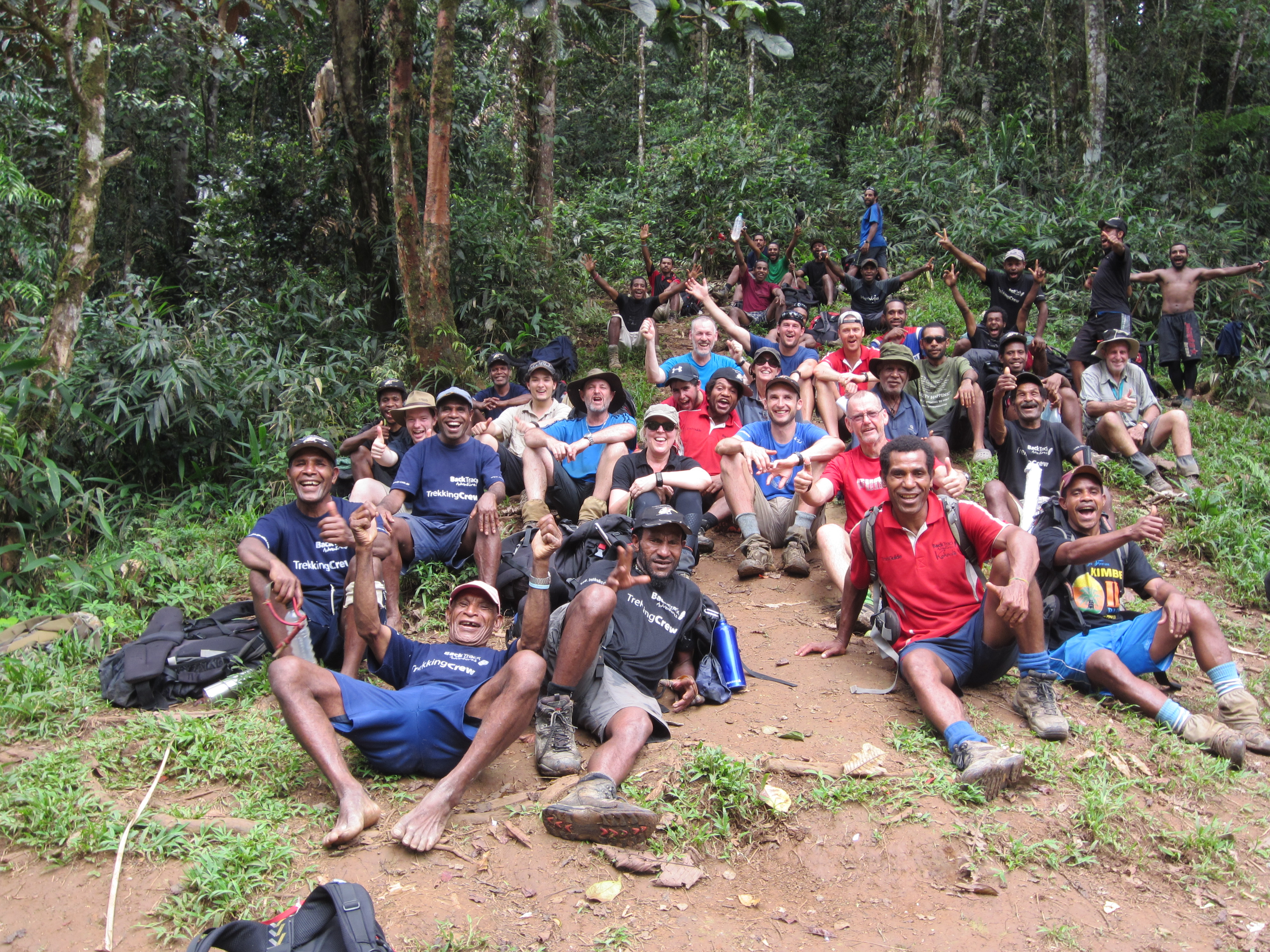 We sat at the top of the ridge for some time, thinking about this… and to add to this story, there is a headstone close to where we sat, marking the spot where a young trekker lost their life in recent years. It was a tough gig, no doubt about it, but we also celebrated our progress with a group photo. I think this image speaks volumes of the wonderful friendships made along this unforgiving jungle track. Friendships that will last a very long time indeed.
