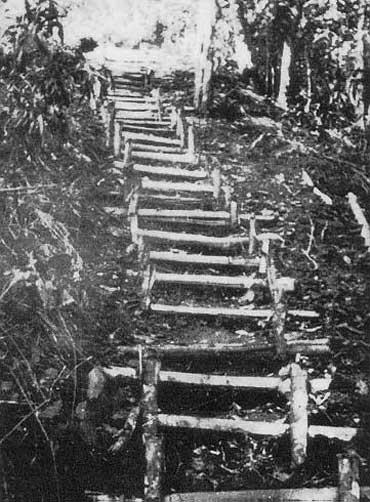 Imita Ridge was reached by the “golden stairs” which consisted of some 2,000 timber steps cut into the mountain side by the engineers. It was an exhausting climb. After leaving the Uberi track it rose 400 metres in the first 2 kilometres, dropped some 500 metres and then rose about 700metres in the last 2.5 kilometres.