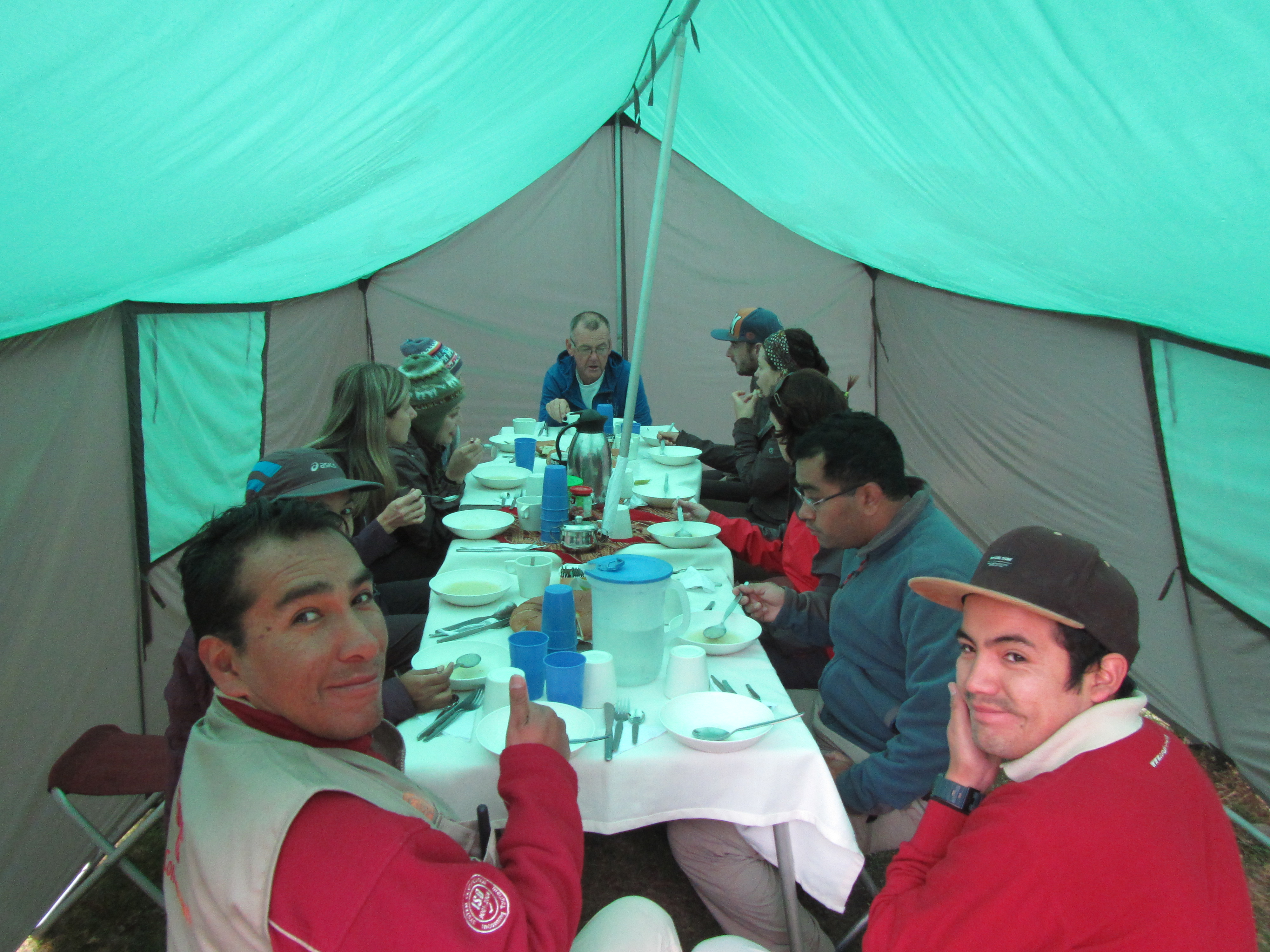 Back to the room service… Our guides Paul and Omar and a couple of the porters are moving about in front of our tents with little tables, cups, hot water and coca tea. They’re also delivering bowls of hot water for each of us to wash our faces etc.. I’m blown away by this simple gesture. It’s a welcome treat as you’re fighting your way out of your sleeping bag, looking oh so glamorous… Coca tea has become my wake up call to the world in this high altitude. It makes everything better… well at least I think it does!