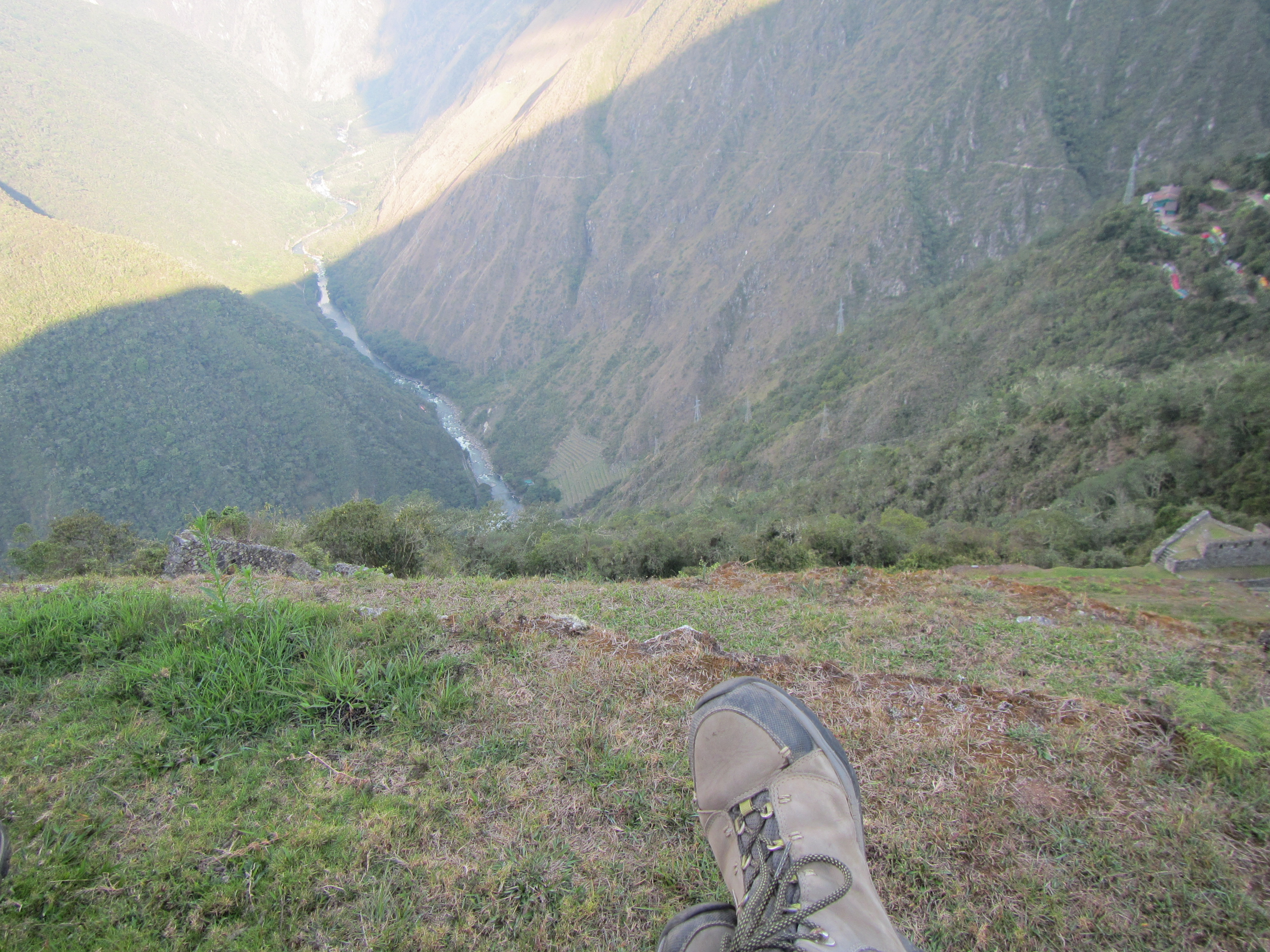 spectacular lookout I have ever seen! The Urubamba River in the valley below is a sight to behold. The mountains seem to go on forever. I can do nothing else but stop and stare. As we sat and took in the view, I looked down at my boots and thought about where they have taken me in this world. They’ve done a lot of miles with me and now they were sitting here with me on top of a mountain in Peru, having a well earned rest!